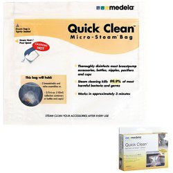 Unique and powerful, Quick Clean Micro-Steam Bags eliminate 99.9% of all harmful bacteria and germs from most breastpump parts and feeding accessories. Fast?complete in just 3 minutes. Unique?faster than boiling and more effective than dishwashing. Easy-to-use?Just add water and heat in the microwave. Economical?5 reusable bags per box (up to 20 uses per bag = 100 uses).
