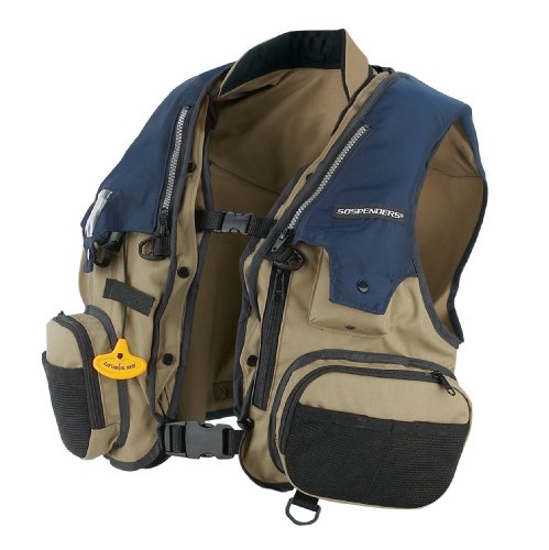 Stearns Sospenders inflatable lifejackets are lightweight and comfortable, allowing freedom of movement while providing maximum buoyancy. This Stearns Sospenders Fishing Vest inflates easily via the 33-gram CO2 cylinder, just by pulling the attached lanyard (or inflate by blowing into the oral inflation tube). Made for convenience and comfort, the Fishing Vest is constructed of a durable nylon shell with a fleece-lined neck. Multiple storage pockets ensure that all your gear is at hand. A cylinder seal indicator shows you at a glance whether your vest is ready for inflation. Uses rearming kit 0932 for repeated use. This Type III personal flotation device is Coast Guard approved. Inflatable PFDs are not recommended for non-swimmers; not for use for active watersports activities (skiing, tubing, wakeboarding, white water, or PWC).